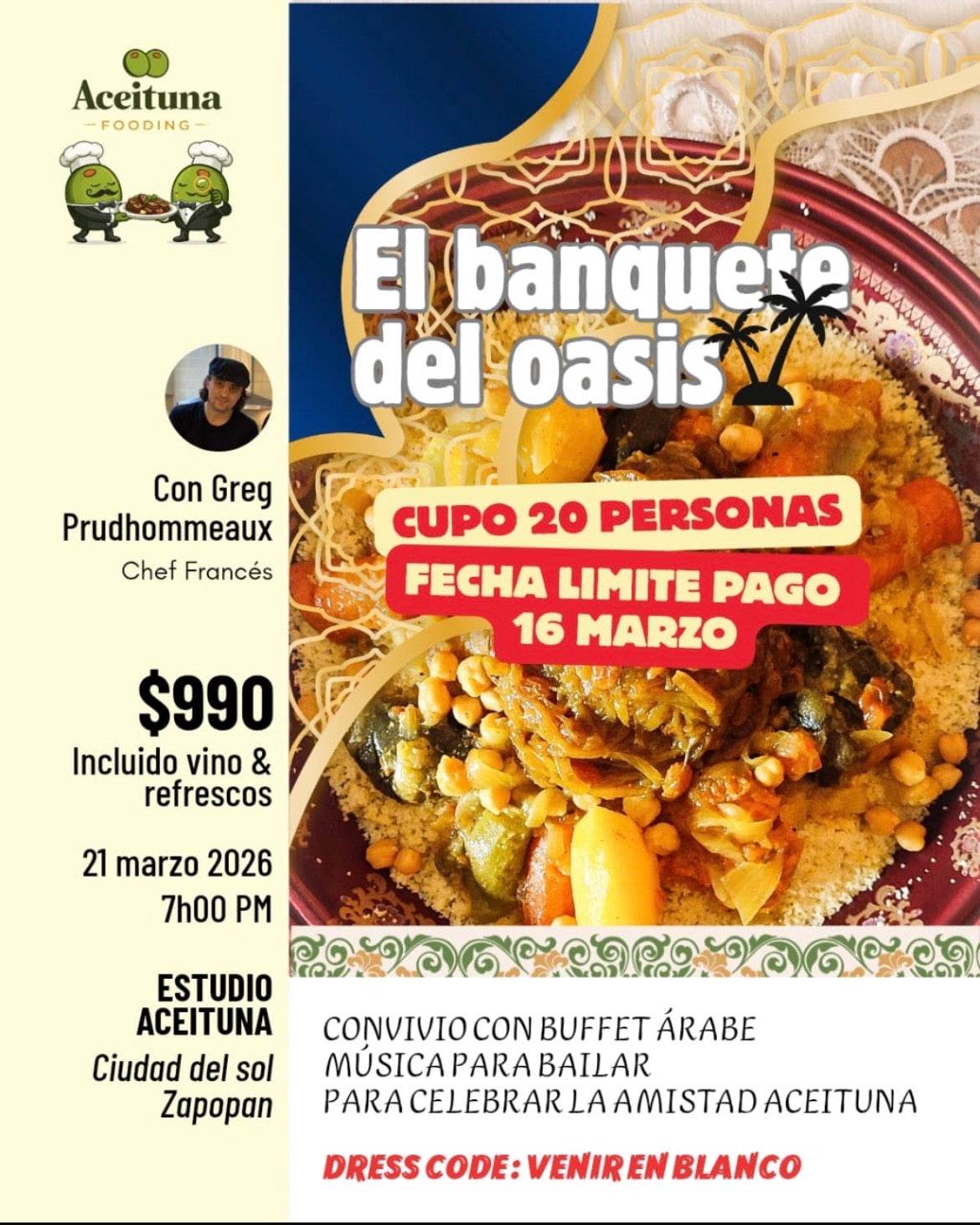 Convivio con buffet arabe, musica para bailar, para celebrar la amistad Aceituna